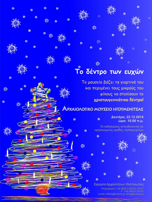 Με μία δράση αφιερωμένη στους μικρούς του φίλους επέλεξε να κλείσει τον κύκλο των εκδηλώσεων για την τρέχουσα χρονιά το Αρχαιολογικό Μουσείο Ηγουμενίτσας. Στις 22 Δεκεμβρίου 2014 και ώρα 10.00 π.μ., το Μουσείο φοράει τα γιορτινά του και περιμένει τους μαθητές των νηπιαγωγείων να στολίσουν το χριστουγεννιάτικο δέντρο με τις δικές τους μοναδικές δημιουργίες.