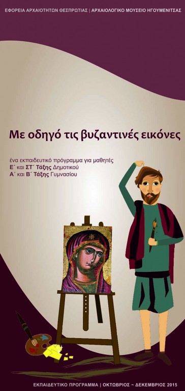 Από 2 Νοεμβρίου έως 22 Δεκεμβρίου 2015 θα υλοποιείται το εκπαιδευτικό πρόγραμμα Με οδηγό τις βυζαντινές εικόνες, που σχεδιάστηκε σε συνεργασία με τον αγιογράφο Εμμανουήλ Μαραγκάκη. Βασική επιδίωξη του προγράμματος είναι να έρθουν οι μαθητές σε επαφή με τη βυζαντινή εικονογραφία μέσα από τη γνωριμία με την τέχνη και τις τεχνικές παραγωγής, τα χρώματα και τη θεματολογία των φορητών εικόνων κατά τη βυζαντινή περίοδο. Οι μαθητές θα έχουν την ευκαιρία να μυηθούν με βιωματικό τρόπο σε όλα τα στάδια παραγωγής μίας εικόνας και να δουν από κοντά τα υλικά κατασκευής, εργαλεία, πινέλα και χρώματα που χρησιμοποιούσε ο βυζαντινός αγιογράφος στο εργαστήρι…