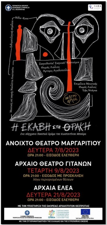 Την Τετάρτη 9 Αυγούστου 2023 στον αρχαιολογικό χώρο Γιτάνων και τη Δευτέρα 21 Αυγούστου 2023 στον αρχαιολογικό χώρο Ελέας θα παρουσιαστεί η θεατρική παράσταση βασισμένη στο σύγχρονο ποιητικό δράμα του Κωνσταντίνου Μπούρα "Η Εκάβη στην Θράκη". (ώρα έναρξης: 9.00 μ.μ.)