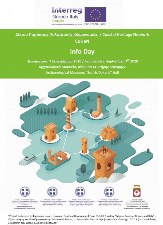 Η Εφορεία Αρχαιοτήτων Θεσπρωτίας διοργανώνει ενημερωτική συνάντηση (info day) στο πλαίσιο του έργου «Δίκτυο Παράκτιας Πολιτιστικής Κληρονομιάς» (Coastal Heritage Network – CoHeN) την 7η Σεπτεμβρίου 2020 και ώρα 10.00 π.μ. στην Αίθουσα «Σωτήρης Δάκαρης» του Αρχαιολογικού Μουσείου Ηγουμενίτσας.