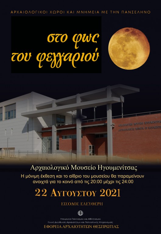 Η Εφορεία Αρχαιοτήτων Θεσπρωτίας σας προσκαλεί να χαρείτε την αυγουστιάτικη Πανσέληνο λαμβάνοντας μέρος στις εκδηλώσεις που διοργανώνει στις 21 και 22 Αυγούστου 2021.