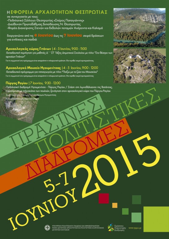 Η Εφορεία Αρχαιοτήτων Θεσπρωτίας συμμετέχει, για δεύτερη συνεχή χρονιά, στην πανελλήνια εκστρατεία "Πράσινες Πολιτιστικές Διαδρομές" που διοργανώνει η Διεύθυνση Μουσείων του ΥΠ.ΠΟ.ΠΑΙ.Θ., με σειρά δράσεων για ενήλικες και παιδιά. Οι δράσεις περιλαμβάνουν: