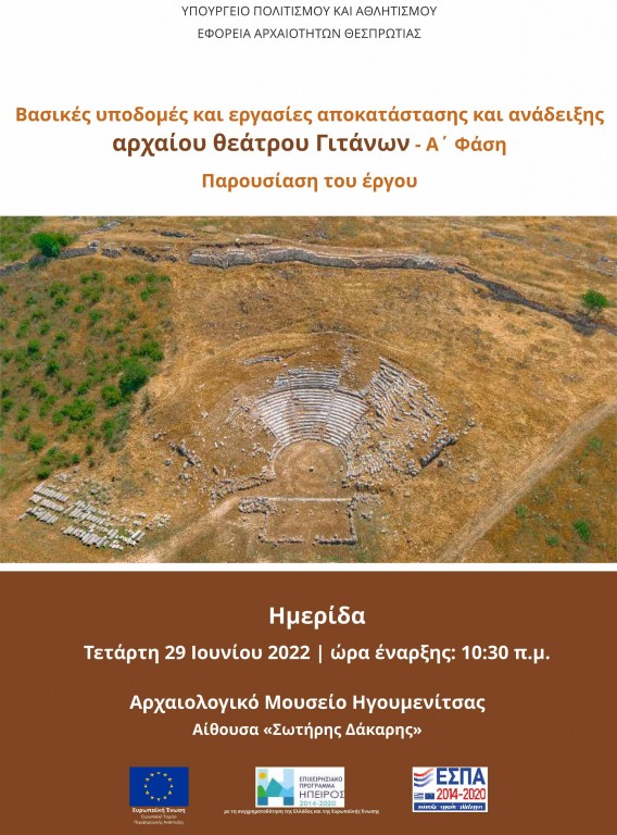 Η Εφορεία Αρχαιοτήτων Θεσπρωτίας σας προσκαλεί στην ημερίδα παρουσίασης του έργου «Βασικές υποδομές και εργασίες αποκατάστασης και ανάδειξης αρχαίου θεάτρου Γιτάνων - Α΄ Φάση», που θα πραγματοποιηθεί στο Αρχαιολογικό Μουσείο Ηγουμενίτσας, την Τετάρτη, 29 Ιουνίου 2022 και ώρα 10.30 π.μ.