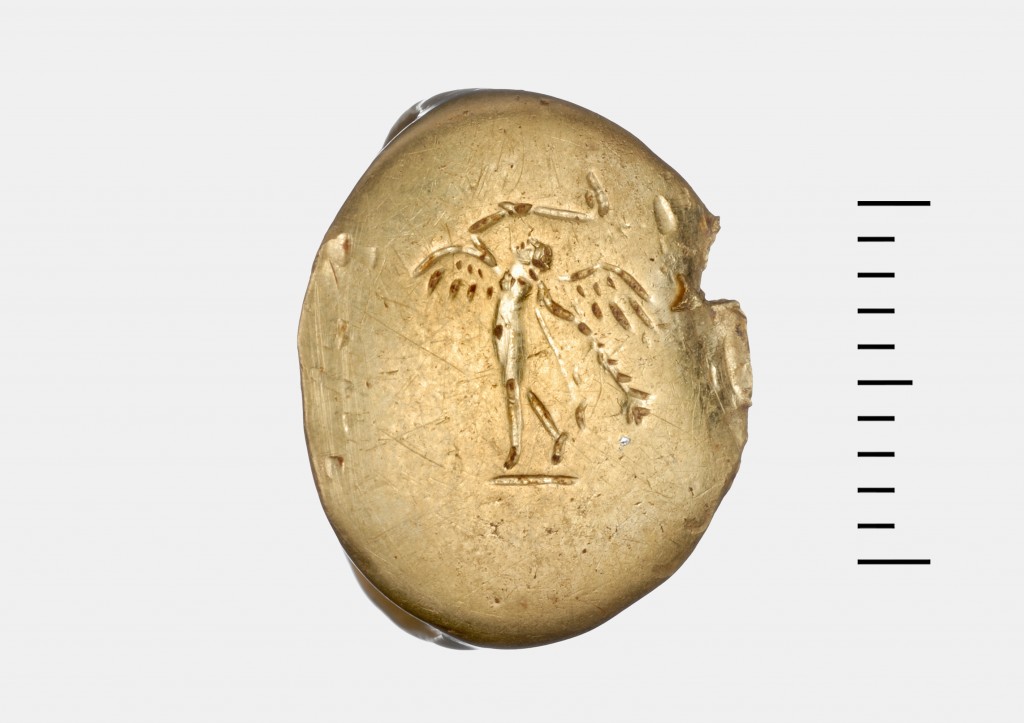 Χρυσό δακτυλίδι με εγχάρακτη παράσταση - φτερωτή μορφή. Αρχές 3ου αι. π.Χ.,…